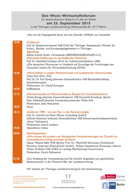 Der Verein zur Förderung lebensgeschichtlichen Erinnerns und biografischen Erzählens e.V. erkundet seit drei Jahren die DDR- Wirtschaftsgeschichte aus der Perspektive ihrer Kapitäne und initiierte anlässlich des 25. Jubiläums der Deutschen Einheit ein Wirtschaftsforum, bei dem Wirtschaftslenker beider ehemaligen, deutschen Staaten zu Wort kamen. Diese Charaktere wurden eingeladen, um anhand ihrer Erfahrungen in großen Wirtschaftseinheiten über zukünftige Ökonomie zu diskutieren.